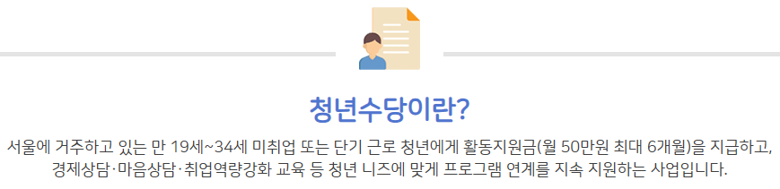 청년수당은 만 19세부터 34세까지 미취업 또는 단기 근로 청년에게 지원하는 서울시에만 있는 정책입니다.